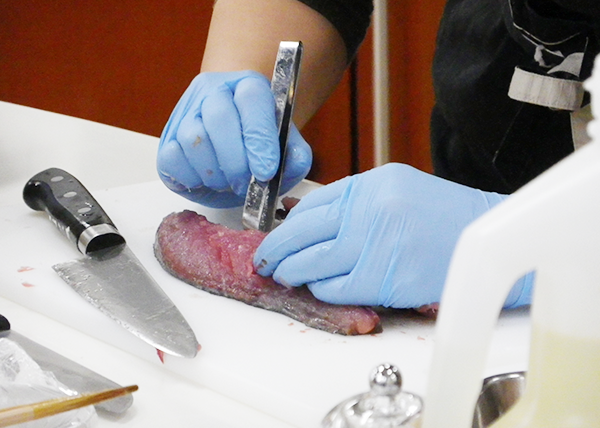 今回はその第2回目として、仙台市ガス局 ガスサロンにてしらはぎ料理学校の三浦あづさ先生からレシピをご紹介いただきました。冒頭に、マルハニチロから簡単な魚クイズをおこない、先生がデモンストレーションを行った後、早速調理実習に入りました。
