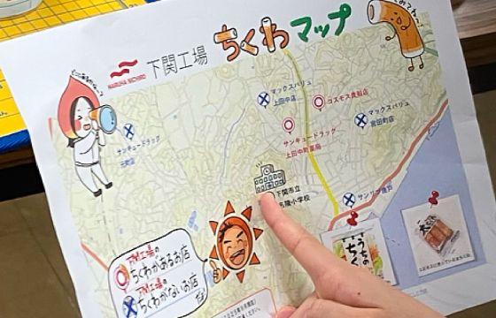 また前回の工場見学からその小学校を中心として周辺のスーパーにマルハニチロのちくわが販売されているか一目でわかるちくわマップというものを作成して小学生に配布しております。