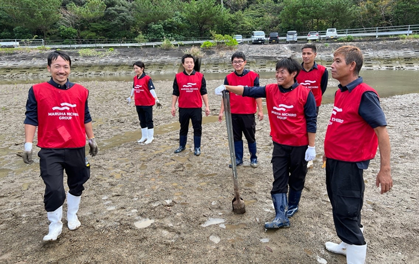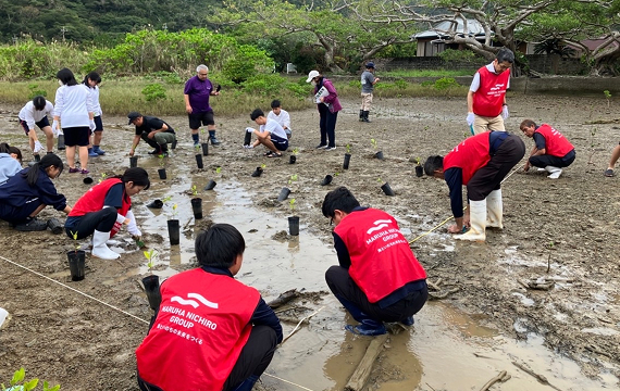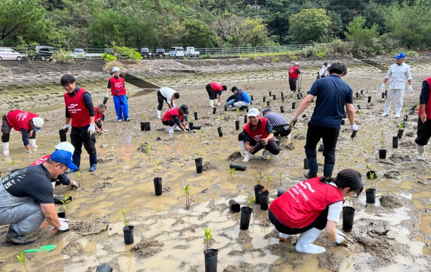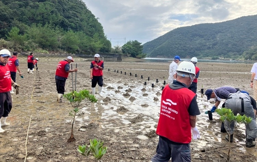 2023年11月10日から11日にかけて、鹿児島県瀬戸内町の諸鈍地区において、2年目となるマングローブ植栽活動を実施しました。マルハニチロのグループ社員と地域の方々が協力し、2日間で約150本のオヒルギの苗木を植栽しました。